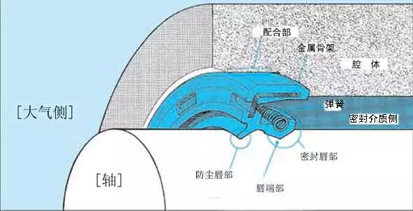 密封唇部是柔性弹性体,设计成对机械的震动及密封流体的压力变动的影响下仍可保持稳定的密封作用,并起到保持唇部与轴表面稳定接触状态的作用。弹簧可提高密封唇向轴的压紧力,起维持此压紧力的作用。唇端部被制作成斜锲形状,在端部处按压轴表面,起密封流体的作用。